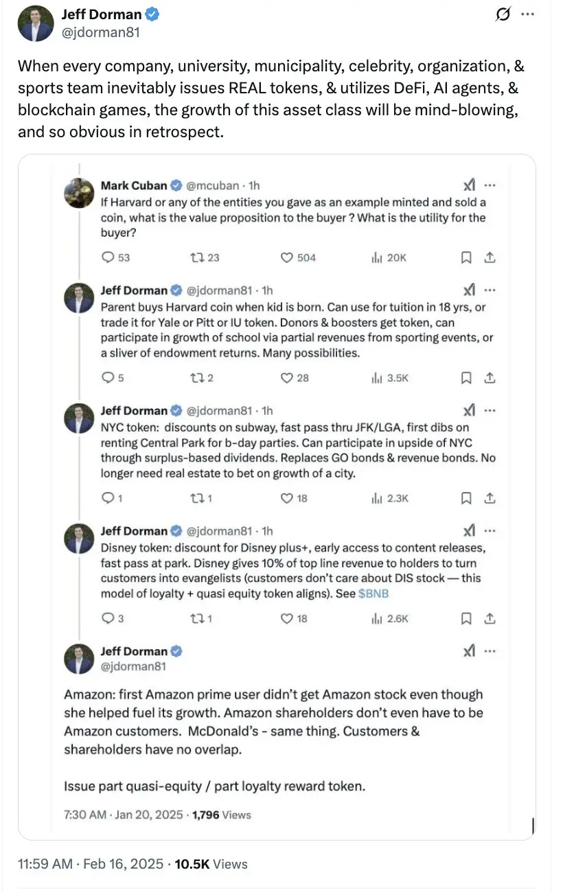 代币可以立即改变这种现状。以币安或 Hyperliquid 为例——这些交易所的客户是早期的代币持有者(通过交易或空投)。您可以使用 HYPE 和 BNB 代币作为抵押品在交易所进行交易,并通过代币回购从其增长中获利。因此,客户实际上成为了准股权持有者,从公司的财务成功中获益,这会推动公司产品的使用量增加、收入提高,进而推动代币价格上涨。但作为其产品的客户,您也可以从拥有 HYPE 或 BNB 代币中获益(通过折扣、抵押品以及在其区块链上支付 Gas 费)。这是一种完美的混合模式,能立即让所有利益相关者保持一致,并将客户转变为忠实用户和推广者。