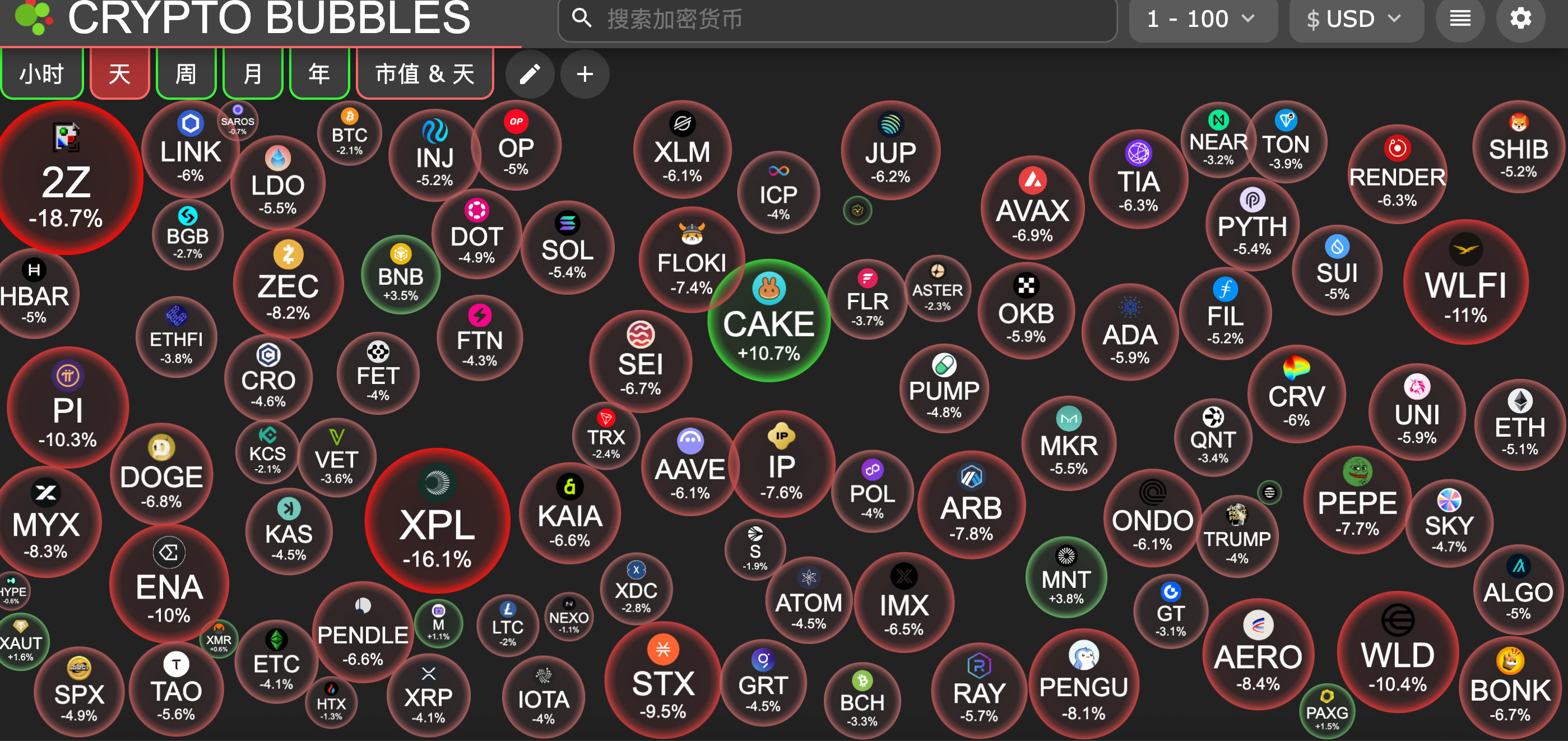 今日市值前100币种最大涨幅:PancakeSwap涨10.7%、Mantle涨3.8%、BNB涨3.5%、Tether Gold涨1.6%、PAX Gold涨1.5%。