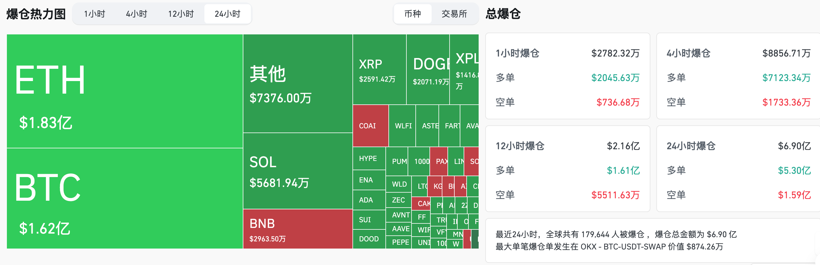 24小时爆仓数据:全球共179644人被爆仓 ,爆仓总金额为6.9亿美元,其BTC爆仓1.83亿美元、ETH爆仓1.62亿美元、SOL爆仓5681.94万美元