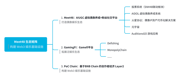 围绕这一愿景,MEET Labs 已孵化轻量级游戏平台 GamingFi,初步形成跨内容的生态矩阵。而这只是开始。MEET48 计划在BSC生态中发展兼容EVM的Layer2 PoC侧链,形成用户、资产、技术、应用的闭环: