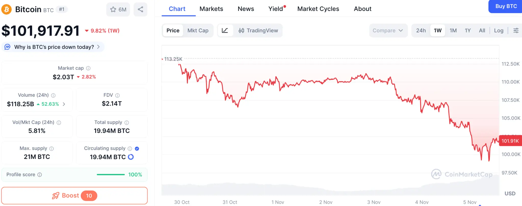 11 月 4 日,加密市场遭遇剧烈冲击,整体陷入低迷。比特币价格一度跌破 10 万美元关口,最低下探 9.9 万美元,这是自年内高点以来最显著的一次回调。与此同时,以太坊也未能幸免,价格最低触及约 3000 美元,创下近半年来的价格新低。山寨币和meme币价格同步大幅下跌,流动性和交易量骤降。