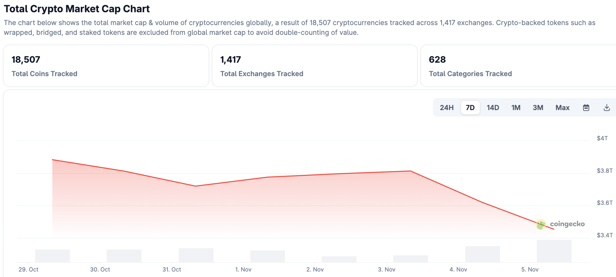 从整体市场表现来看,这并非孤立行情。当日全球风险资产普遍走低,加密市场同步承压。根据 Coingecko 数据,截至 11 月 5 日,加密市场总市值约为 3.45 万亿美元,较 11 月 3 日(约 3.81 万亿美元)已下跌约 9.5%。