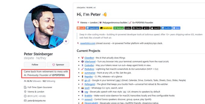 Peter 在个人主页上写道:"从退休中复出,来折腾 AI"(Came back from retirement to mess with AI)。这句轻描淡写的话,预示着他第二次生命的开始。