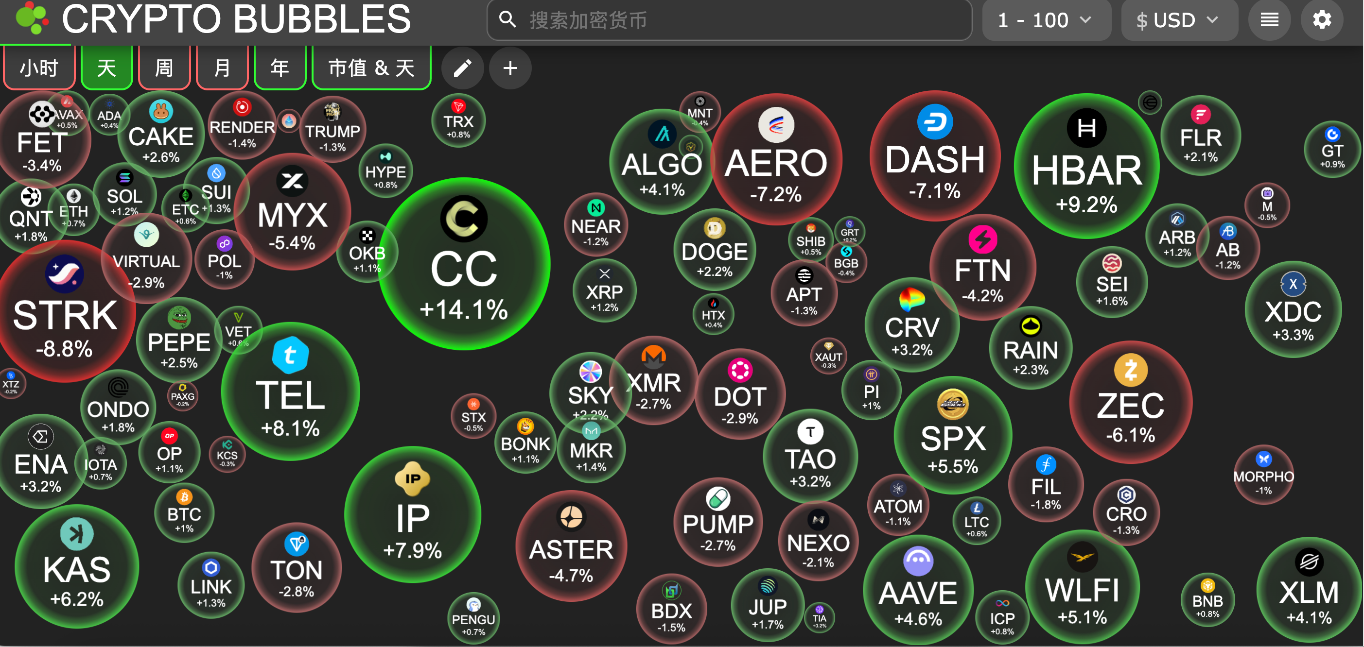 今日市值前100币种最大跌幅:Starknet跌8.8%、Aerodrome Finance跌7.2%、Dash跌7.1%、Zcash跌6.1%、MYX Finance跌5.4%。