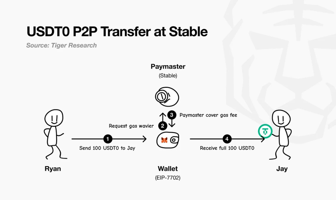 正如 Tiger Research 的流程图所展示的,其流程是:付款方发起支付;EIP-7702 钱包向 Stable 的支付主管(Paymaster)申请 Gas 费豁免;支付主管赞助并结算网络费用;最终,收款方收到全额款项,无任何扣费。在实践中,用户只需要持有 USDT 即可。