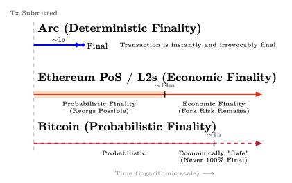 Arc 提供约 1 秒的确定性最终性——当 ≥2/3 验证者完成确认后,交易即刻不可逆地最终确认(无重组风险);以太坊权益证明及其二层解决方案约 12 分钟后达成经济最终性,经历初始可能重组的概率性阶段后过渡至“经济最终”状态;比特币则呈现概率最终性——随着时间累积确认数,约 1 小时后达到“经济安全”状态,但数学层面永远无法实现 100% 最终性。