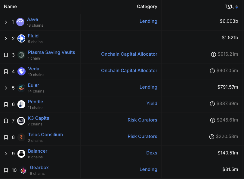 自主网测试版上线以来,其增长势头有目共睹。截至 9 月 29 日,Plasma 链上的 Aave 存款已突破 65.亿美元,成为其第二大市场;到 9 月 30 日,已有超过7.5 万名用户注册了其生态钱包 Plasma One。据 DeFiLlama 最新数据,目前 Plasma 上 Aave TVL 为 60 亿美元,虽较峰值有所回调,但仍稳居 Aave 第二大市场——仅次于以太坊(539 亿美元),并显著领先于 Arbitrum 与 Base(均约 20 亿美元)。此外,Veda、Euler、Fluid 和 Pendle 等项目也贡献了可观的锁仓量。