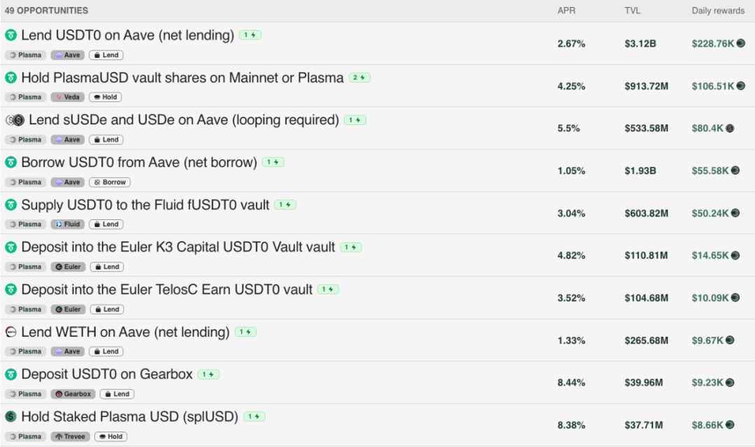 Plasma 的早期 TVL 增长也受益于激励预算:根据官方代币经济模型,XPL 代币总量的 40% 被分配给生态系统与增长基金。其中 8%(即 8 亿枚 XPL)在主网测试版上线时立即解锁,用于启动合作伙伴的 DeFi 激励、流动性需求及交易所整合;其余 32%(32 亿枚 XPL)则按月在三年内逐步释放。目前 Plasma 链上主要流动性池在基础收益率之外,通过 XPL 奖励仍可获得约 2-8% 的额外收益。
