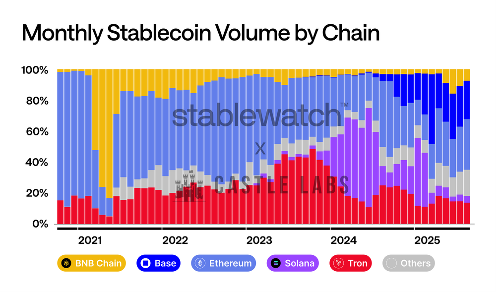 稳定币交易量的竞争向来激烈。市场格局的动态变迁清晰可见:早期由以太坊主导,随后波场强势崛起,2024 年索拉纳异军突起,近期 Base 链也势头渐起。没有任何一条链能长期稳坐头把交椅——即便是最深的护城河也会面临月度份额的争夺。随着专精于稳定币的公链入场,竞争必将白热化,但现有巨头不会轻易让出市场份额;可以预见,它们将在手续费、最终性、钱包用户体验以及法币兑换通道集成等方面采取激进策略,以捍卫并扩大其稳定币交易量。