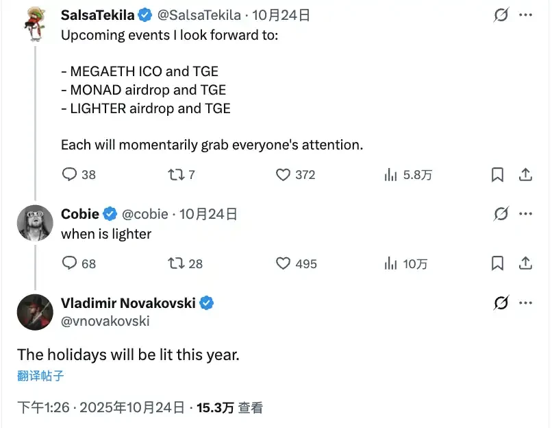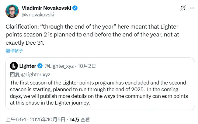 上个月中旬,Lighter 创始人兼 CEO Vladimir Novakovski 在 YouTube 的一场俄语 AMA 中表示,第二季积分活动将持续至 TGE。结合他此前在 X 平台上提到的「积分活动会在年底前结束,但不会持续到 12 月 31 日」,以及他近日对社区成员留言「the holidays will be lit this year」(今年的假期将会很精彩),让空投时间的预期更加明朗。