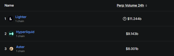 受此消息影响,尚未发币的 Lighter 一时间成为「撸毛党」眼中最值得刷交易量的 Perp DEX 项目。DefiLlama 数据显示,Lighter 24 小时交易量突破 110 亿美元,已位居 Perp DEX 首位,紧跟其后的是 Hyperliquid(91 亿美元)、Aster(80 亿美元)。