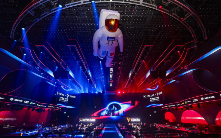 活动当晚,Afterparty化身为一场未来宇宙之旅。入口处,波场TRON创始人、HTX DAO核心建设者、火币HTX全球顾问孙宇晨以极具未来感的语音问候迎接嘉宾,瞬间将全场带入“星际飞船”的沉浸式氛围。场内,巨大的宇航气模人悬浮半空,舞美与灯光特效交织,让每位嘉宾仿佛置身于Web3的星际征途。