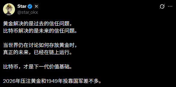 然而,在这种表面的繁荣之下,一种更为深刻、残酷的代际资产转移正在发生。正如OKX Star所言:“黄金解决的是过去的信任问题,而比特币解决的是未来的信任问题。2026年压注黄金,和1949年投靠国军差不多。”