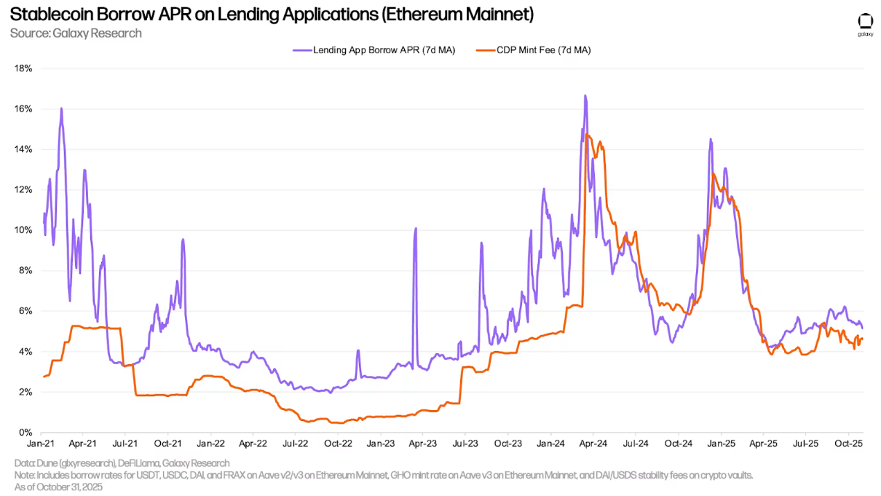 截至 10 月 31 日,稳定币加权平均借贷利率从 6 月 30 日的 4.23% 略微上升至 4.83%。该数据通过借贷协议的借款成本和 CDP 稳定币铸币费,并根据未偿还借款额加权计算得出。