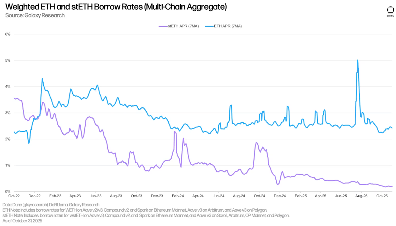 与 WBTC 类似,stETH 的借贷成本通常较低,因为该资产主要用作抵押品,用途不多。