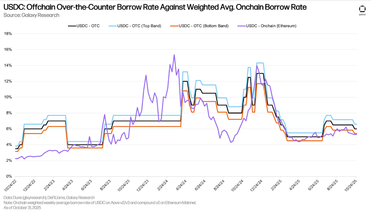 本季度 USDC 的场外(OTC)基准利率有所上升,从 6 月 30 日的 5% 上升至 9 月 30 日的 6.5%。然而,此后该利率略有下降,降至 6%。本季度 USDC 的链上利率更接近场外利率的底部(风险最低)区间,且在第三季度内未超过场外利率的中间值,以周平均利率计算。