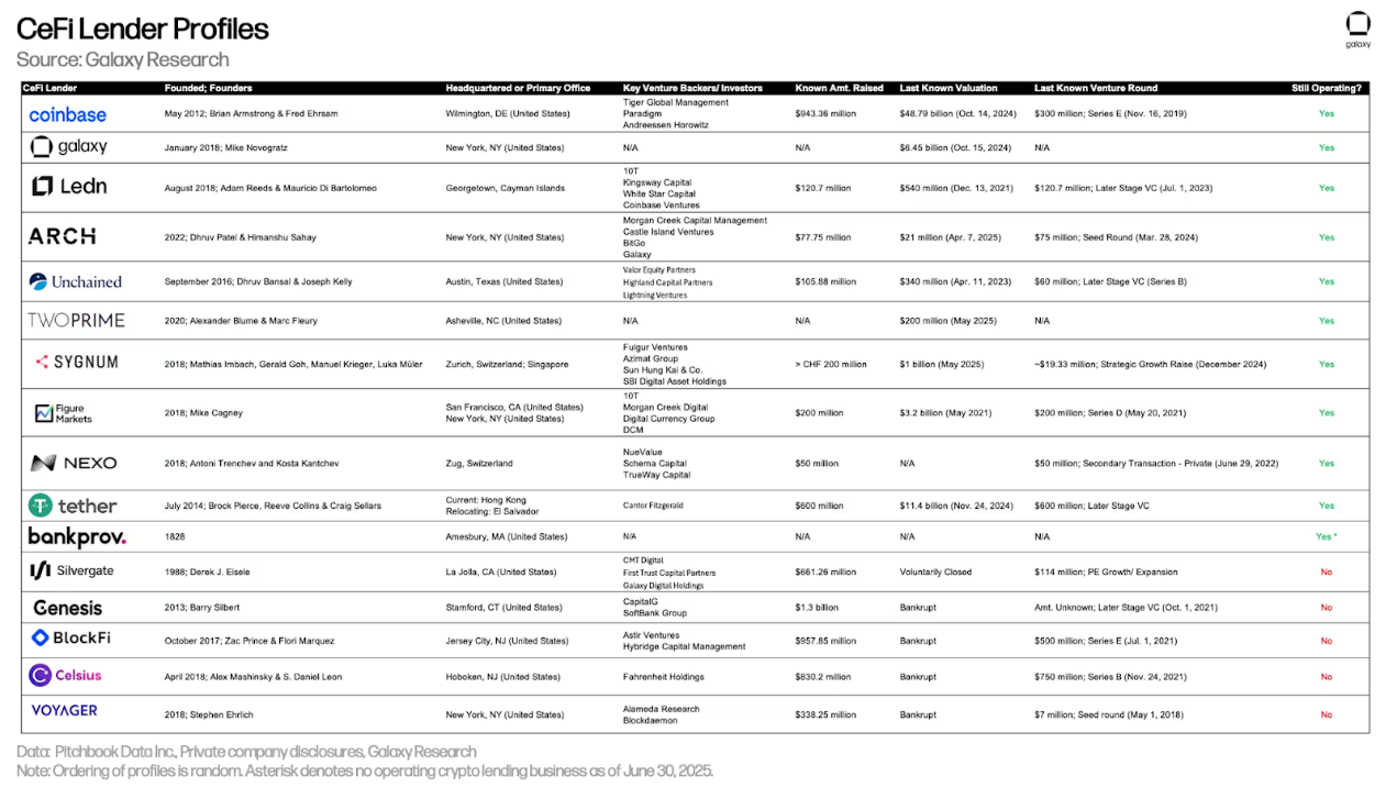下表对比了市场分析中的 CeFi 加密借贷公司。其中一些公司为投资者提供多种服务。例如,Coinbase 主要作为交易所运营,但也通过场外加密货币贷款和保证金融资向投资者提供信贷。不过,该分析仅显示了其加密货币抵押贷款业务的规模。