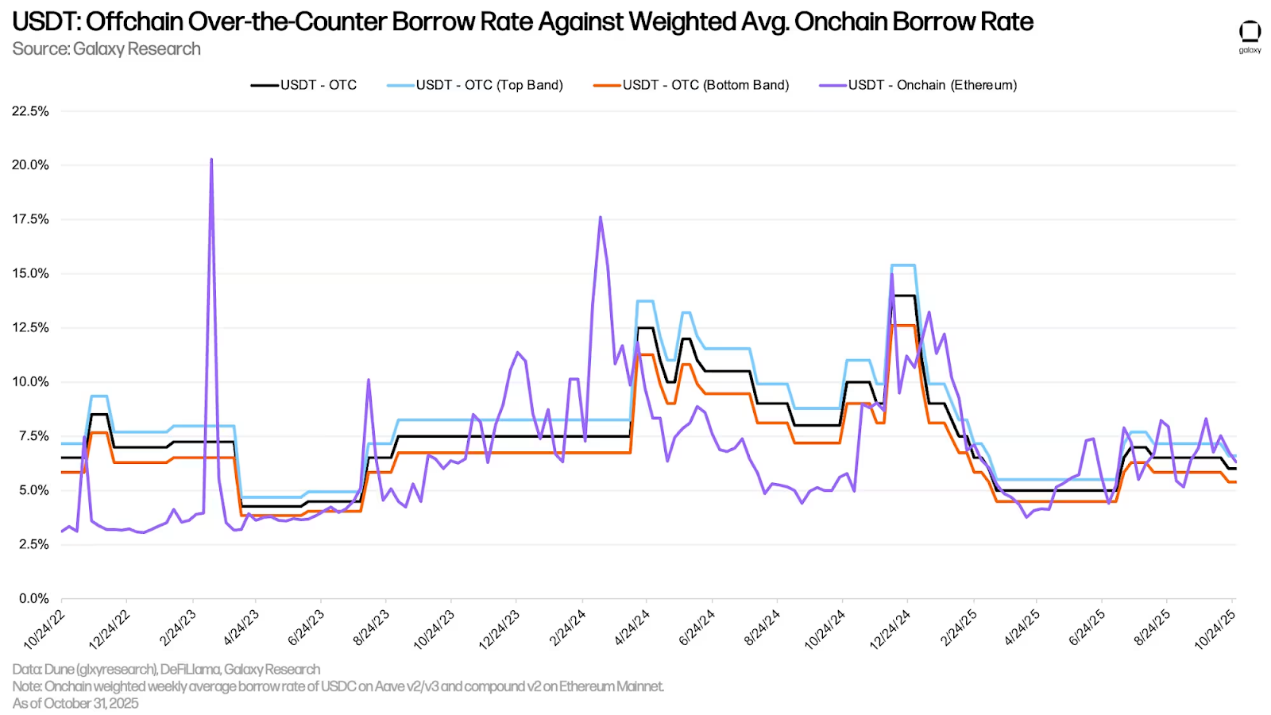 下图追踪的是与上图相同的利率,但针对的是 USDT 借贷。USDT 的链上利率比 USDC 更接近场外交易中间价。