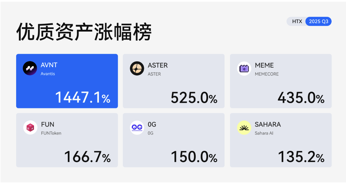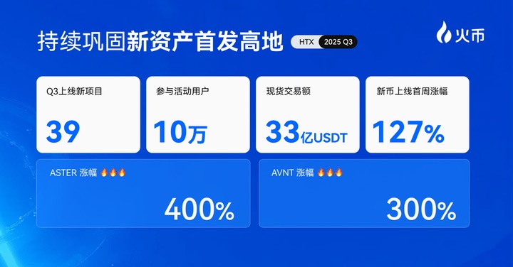 第三季度,火币HTX共上线39个优质新项目,成为新资产首发的主要阵地,包括TREE、CAMP、WLFI、HOLO、LINEA、AVNT、ASTER、0G、XPL、FF等热门项目,覆盖MEME、DeFi、AI、基础设施(L1/L2)、衍生品(Perp DEX)等多个主流赛道,其中不少项目更在上线后实现显著涨幅。