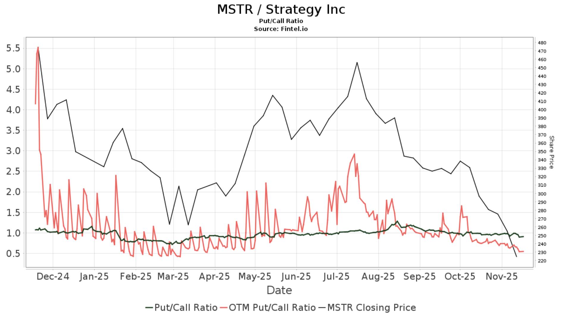 此外,Fintel数据显示,当前MSTR未平仓合约看跌/看涨比率为0.74,通常比率大于1时通常表示市场情绪偏空,而比率小于1则表示市场情绪偏多。