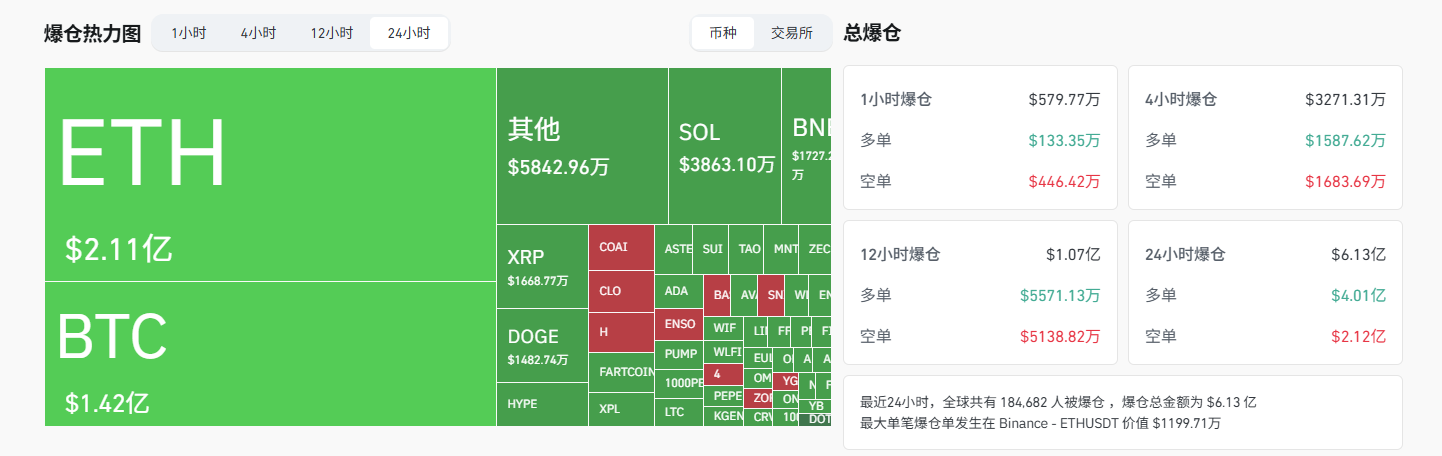 - 24小时爆仓数据:全球共184803人被爆仓 ,爆仓总金额为6.14亿美元,其BTC爆仓1.42亿美元、ETH爆仓2.11亿美元、SOL爆仓3863万美元