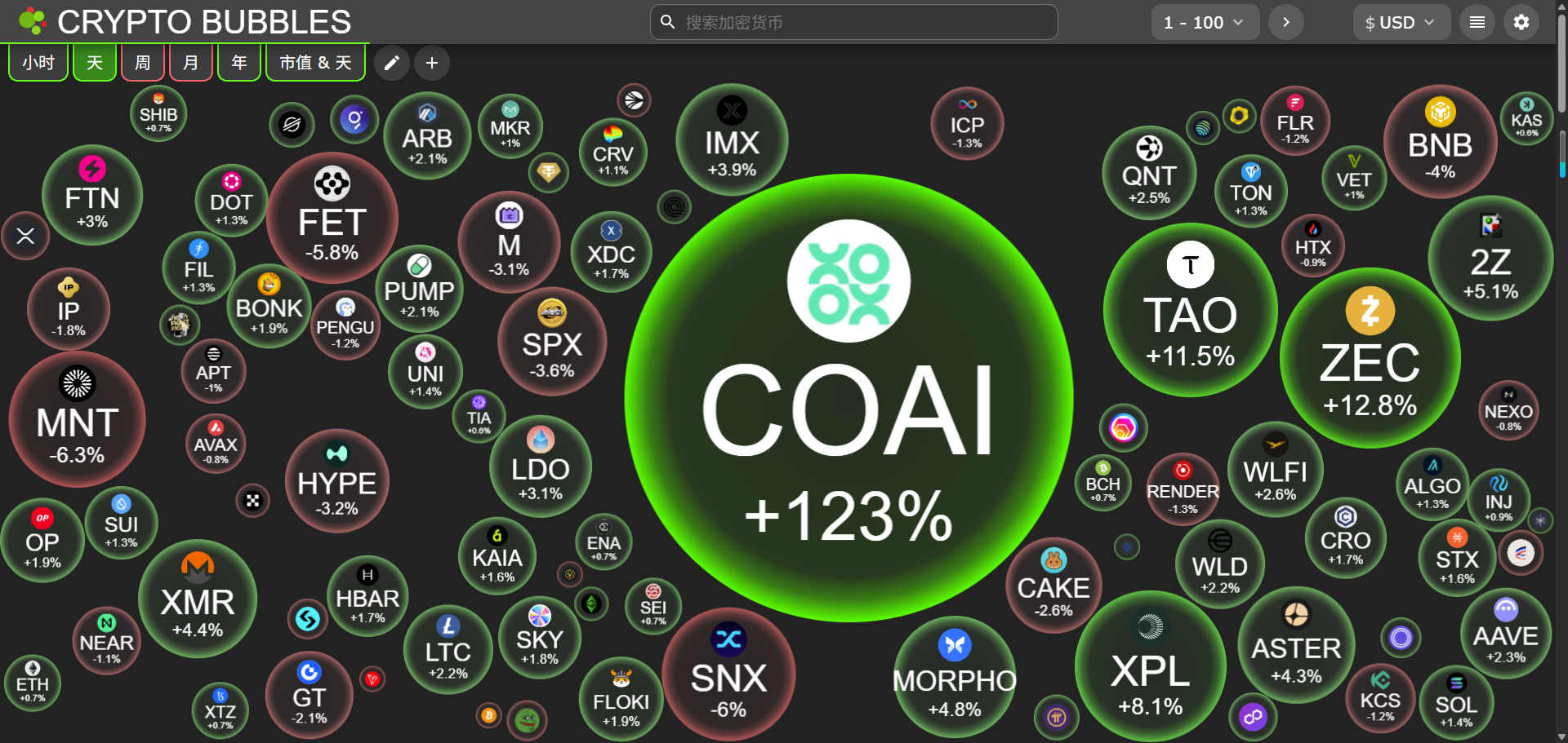 今日市值前100币种最大涨幅:COAI涨123%、ZEC涨12.8%、TAO涨11.5%、XPL涨8.1%、2Z涨5.1%。
