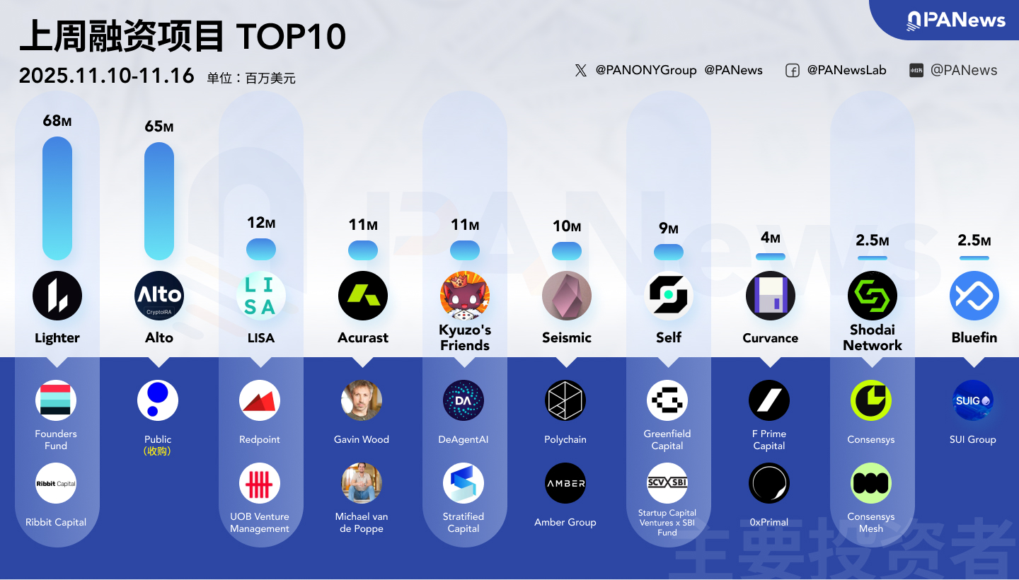 - DeFi方面公布了3起投融资事件,其中Lighter完成6800万美元融资,由Founders Fund与Ribbit Capital领投;