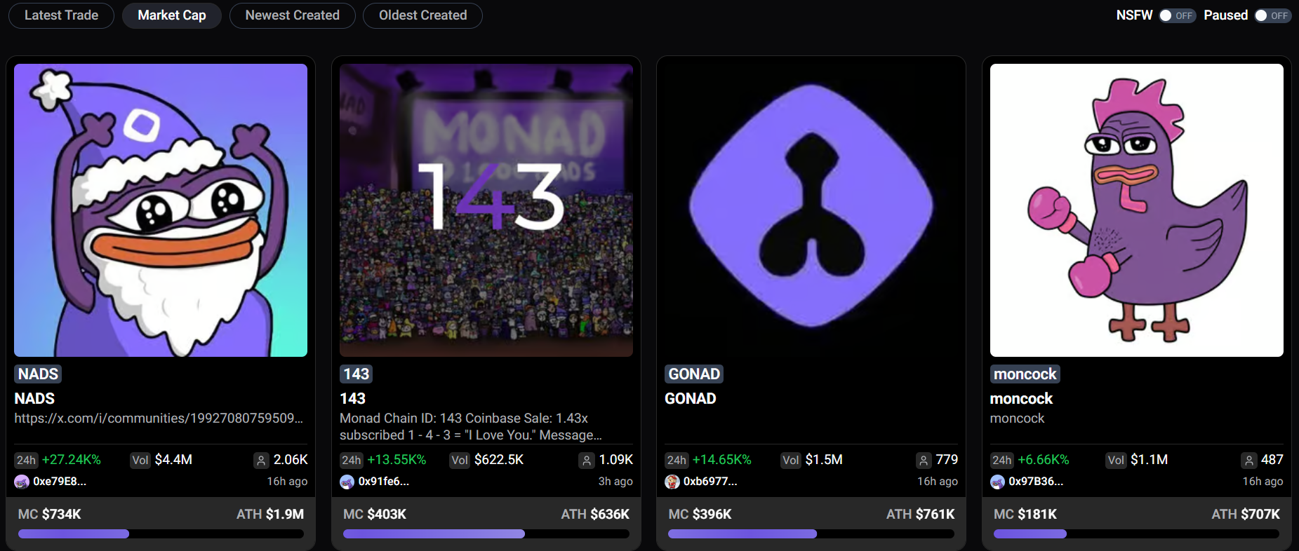主网上线后,Nad.fun已生成30个新Meme代币。目前,市值最高的Meme币是NADS,为73万美元,ATH(历史最高)市值一度接近200万美元。