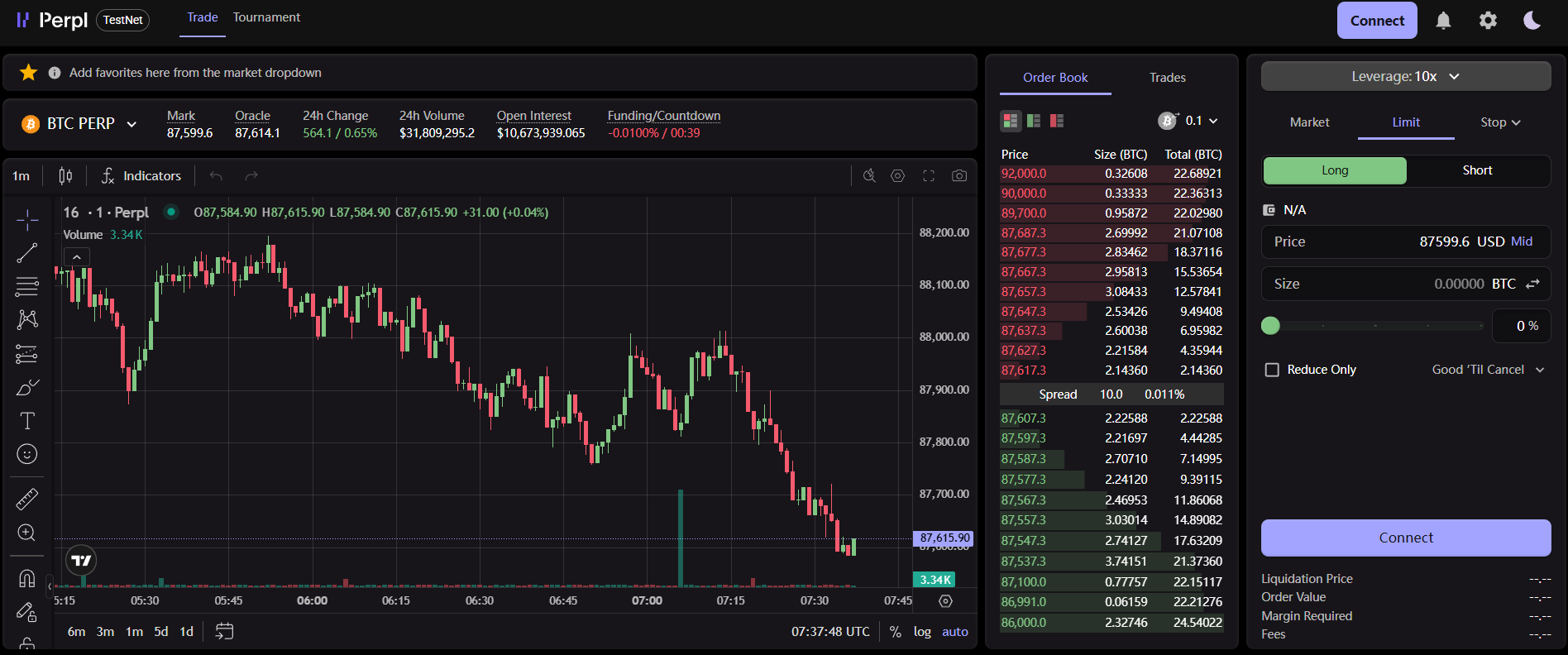 Perpl是构建在Monad上的全链Perp DEX(去中心化永续合约交易平台),同样采用了CLOB模型。衍生品交易对喂价、清算与保证金的实时性要求极高,任何延迟都可能导致高额滑点或清算风险。协议正是利用Monad的高吞吐量和亚秒级终局性,保证订单匹配与交易执行的全流程都可以在链上完成,从而消除了对链下排序器等中心化组件的依赖,来进一步提升交易的透明度和效率。