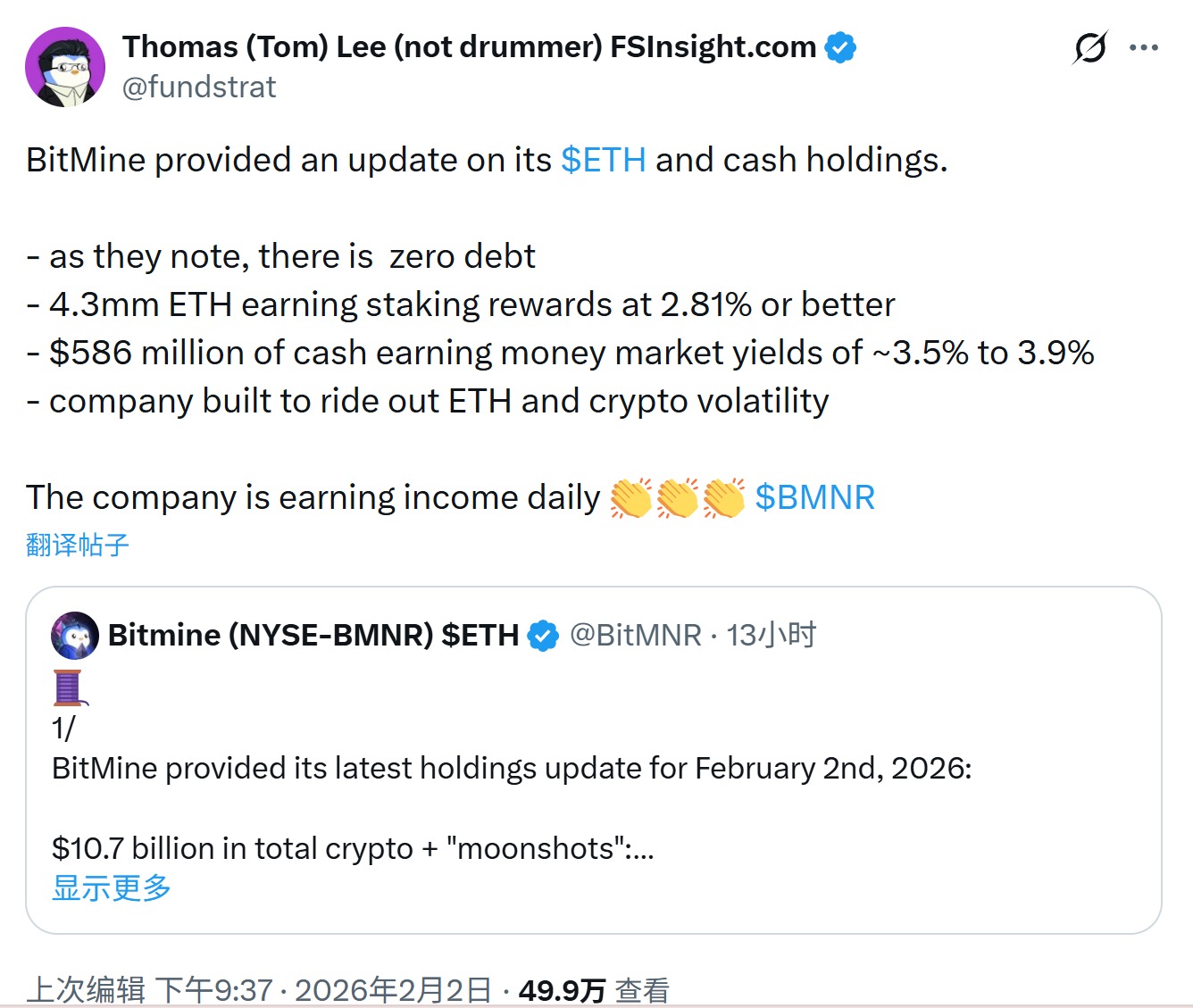 事实也的确如此,与多数市场想像不同的是,BitMine 的结构并不激进。正如Tom Lee 在2 月2 日的社交发文所强调:他们拥有5.86 亿美元的现金储备,且67% 的ETH 处于质押中,每天能产生超过100 万美元的现金流,对他而言,下跌只是账面数字的缩水,而非生存危机的降临。