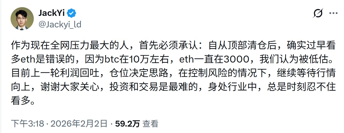 就在Tom Lee 发文的同一天,易理华亦公开反思:作为现在全网压力最大的人,首先必须承认过早看多ETH 是错误的……目前上一轮利润回吐,在控制风险的情况下,继续等待行情向上。