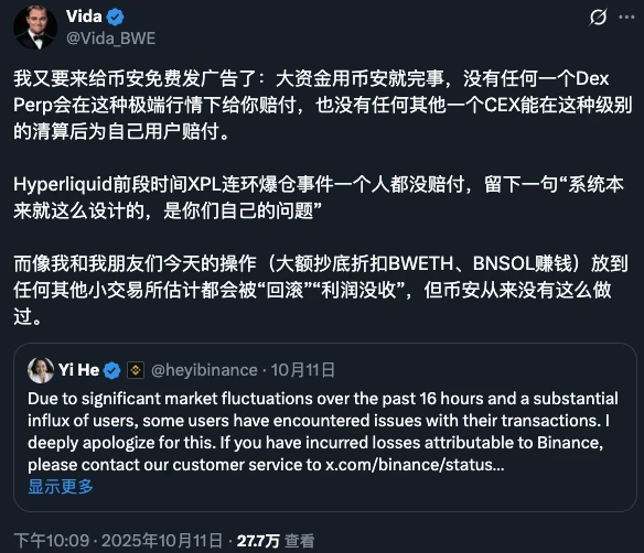 当性能不再成为 CEX 与 DEX 之间的主要差距,所有投资者真的都会主动选择 DEX 吗?在此次“10.11”大跌后,虽然币安被部分舆论攻陷,但 00 后交易员 Vida 依然 公开表示,大资金应该用币安,理由是币安无论在任何时候都会对自己的用户负责。