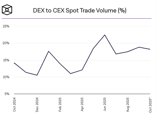 据 The Block 数据,在现货市场中,与 CEX 相比,2025 年 DEX 的市场份额整体呈增长态势,2025 年第三季度达到 19%。