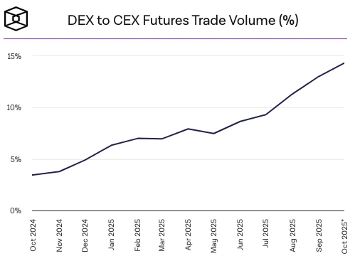 在永续合约市场中,DEX 的市场份额增长更为迅速,由 2024 年底 DEX 的合约市场仅为 CEX 的 4.9%,而到了 2025 年 10 月该数字增长至 14.33%。