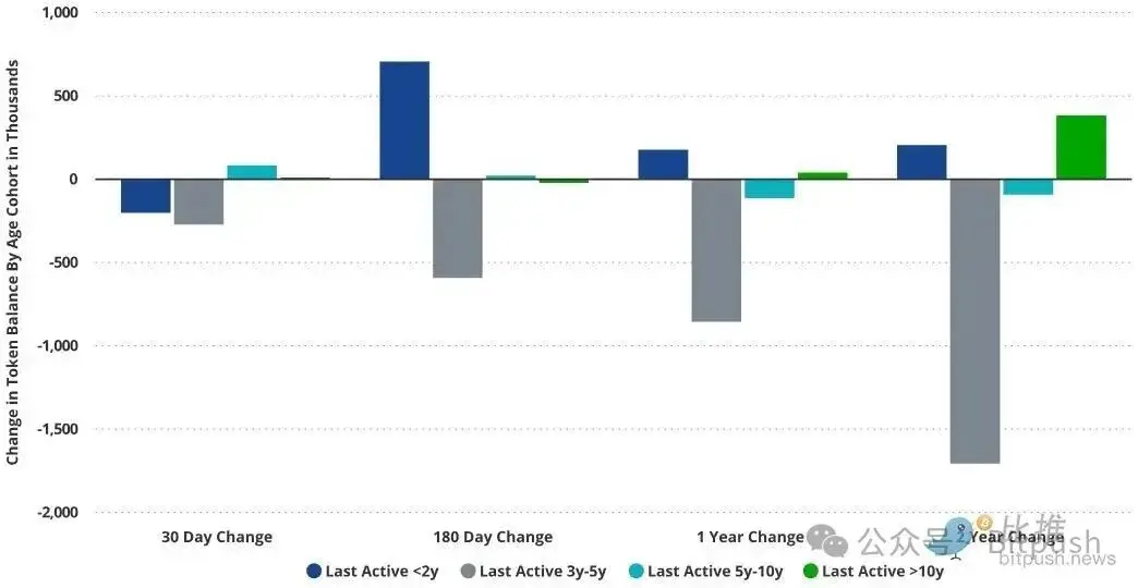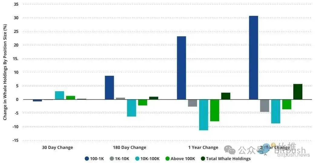 较小巨鲸在1-2年内积累、而最大巨鲸在卖出;近期净变化持平