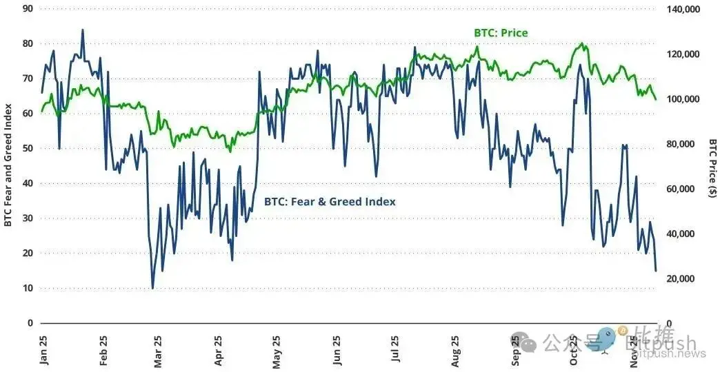例如,一个"中本聪时代"的巨鲸在2025年11月14日当周出售了价值15亿美元的BTC,清空了他的整个钱包。许多人认为,资深的巨鲸通常通过在关键时点买卖BTC来预示BTC的长期走势。因此,加密货币社区变得看跌,恐惧/贪婪指数在关税恐慌开始时跌至2025年3月以来的最低水平。