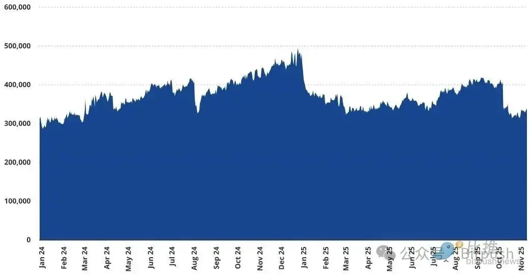自2025年10月10日起,BTC ETP 余额流出了49.3千枚BTC,约占管理总资产(AUM)的-2%,因在价格峰值附近买入的弱势持有人在降息不确定性和AI叙事动摇中选择了投降。