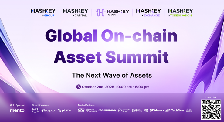 此次峰会获得Mento Labs、Amazon Web Services、Clearpool、Plume 等机构联合赞助。峰会报名通道已进入倒计时阶段,如需锁定参会资格,请访问https://luma.com/l4pbe2m6 进行报名。HashKey Group期待与全球行业伙伴共同开启一场链上金融未来的盛会。