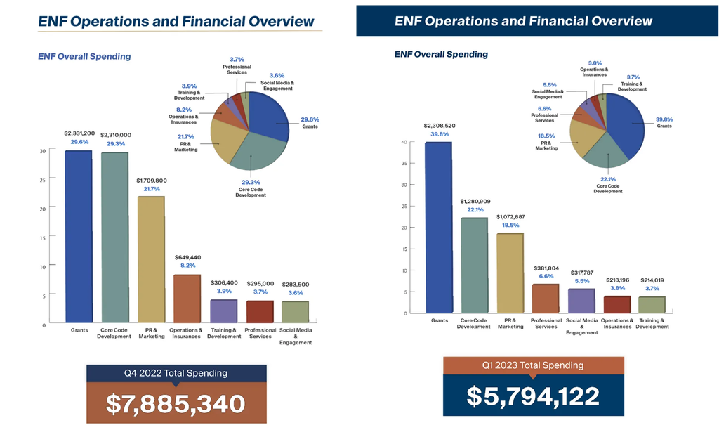 从 2021 年 Q4 到 2023 年 Q4,尽管 Grants 一直是季度支出中占比最大的项目(部分季度甚至占到总支出的 40%~60%)。但报告却:不再公布具体拨款对象;不公布各项目实际领取金额;不披露项目验收情况;不提及资金使用明细;不说明项目是否按里程碑兑现成果;