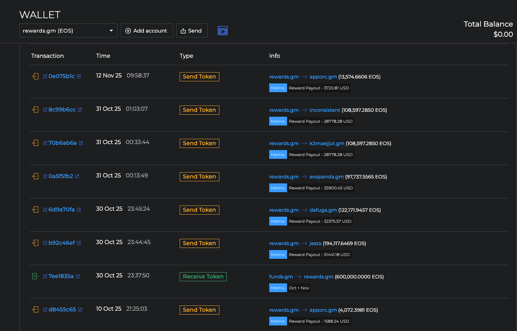 链上数据显示:资金由基金会 eosio.mware 账户打入 Greymass 同期新设立的账户 uxuiuxuiuxui;随后,该钱包按月向 http://funds.gm 账户转账,并备注「Operation + USD/CAD 价格」,形似「工资发放」;再由 http://funds.gm 向 http://rewards.gm 转账,最终分发给若干账户如 jesta、inconsistent、http://apporc.gm 等,并注有「Reward Payout+USD 数额」的转账记录;多数受薪账户在领取后快速转入 krakenkraken 账户或 Coinbase 等交易所套现。