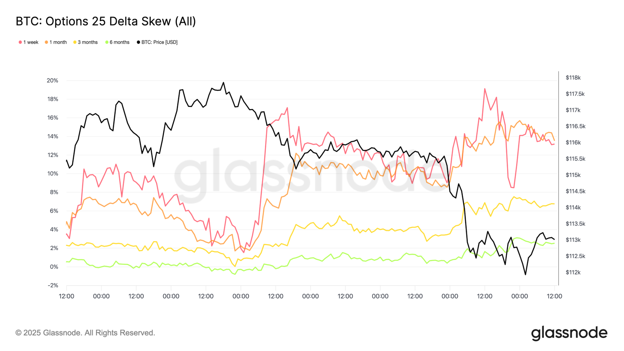期权市场重新定价激进,偏斜度飙升,看跌期权需求旺盛,表明防御性头寸布局,宏观背景表明市场日益疲惫。