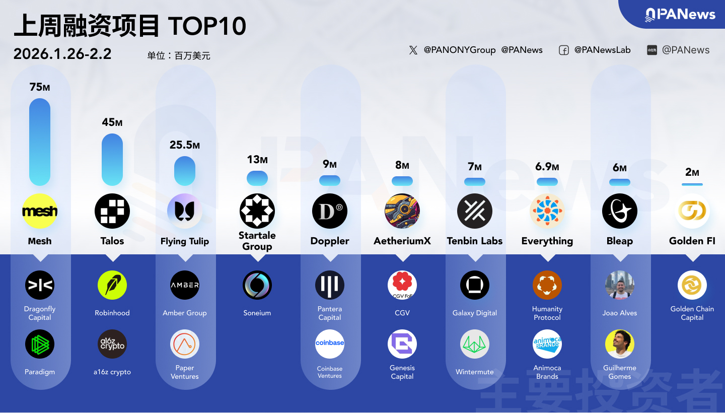据 PANews 不完全统计,上周(1.26-2.1)全球区块链有10起投融资事件,资金总规模超1.97亿美元,概览如下概览如下: