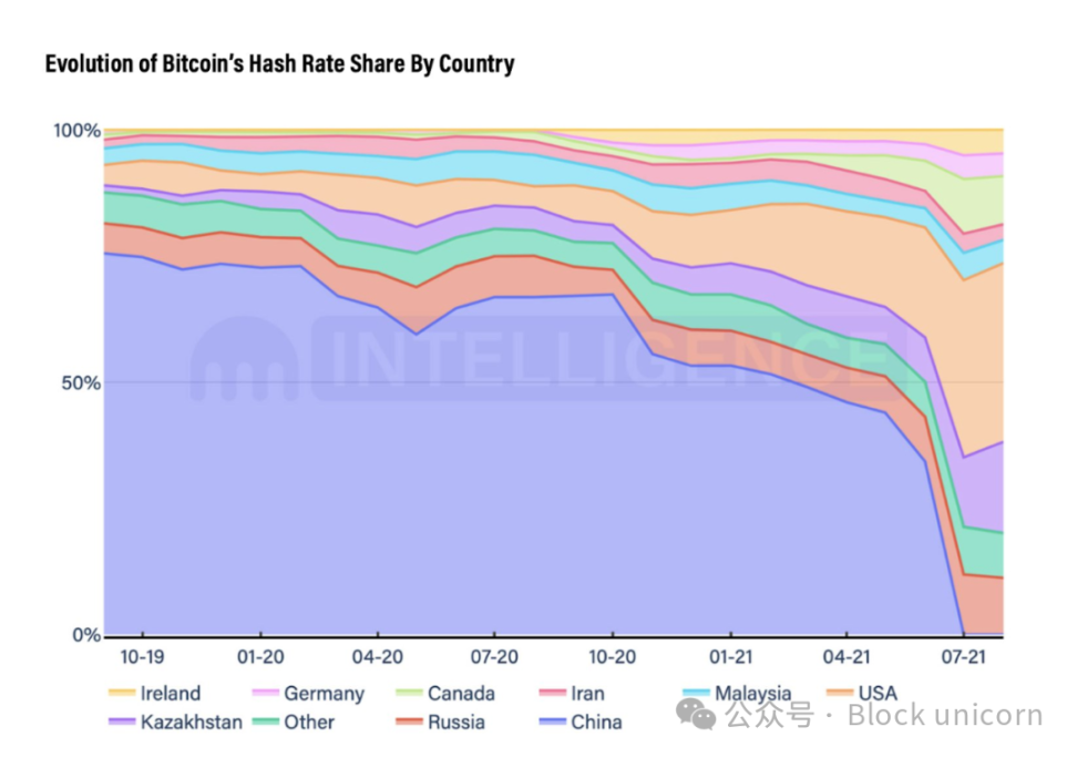 2021 年,监管力度进一步升级,在最初的监管基础上,2021 年 5 月,金融机构和支付公司被禁止提供与加密货币相关的服务。2021 年 6 月,内蒙古、新疆和四川等主要挖矿中心出台了一项打击比特币挖矿活动的措施,理由是电力消耗对环境造成影响。此次打击导致中国大型比特币挖矿公司大批迁往哈萨克斯坦和俄罗斯等邻国,这些国家目前占据了全球算力的很大份额。