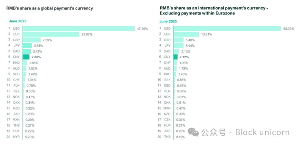 面对美元主导地位的增强,中国加大了在稳定币领域的投入,以推动人民币国际化。人民币目前仅占全球支付总额的约 2.9%。中国的主要工作重点仍然是推广其央行数字货币(CBDC)——数字人民币(e-CNY),旨在增强货币主权,减少对以美元为基础的国际金融体系的依赖。