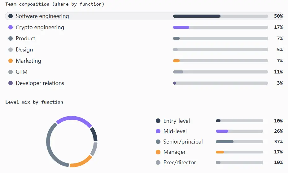 - 工程(软件和加密)岗位约占总员工数的 67%,涵盖不同规模、阶段和融资轮次的企业