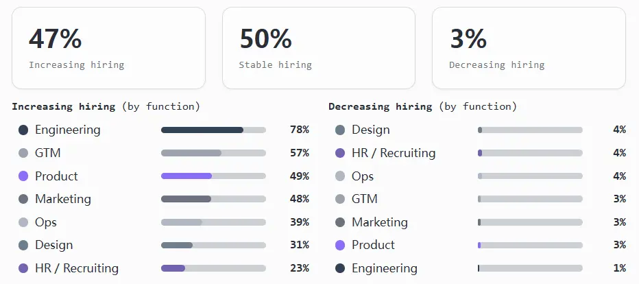 - 工程部门引领增长,约 78% 的团队在扩张,仅有 1% 的团队在裁员。这也是唯一一个有真正初级职位招聘渠道的部门。