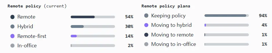 - 超过一半的公司完全远程办公,超过四分之一的公司采用混合模式,而远程优先的公司占比较小,为 14%。