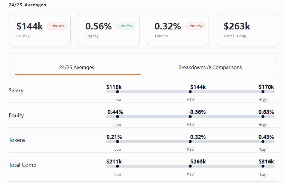 几乎所有层级的薪资和代币奖励都有所下降。美国岗位的现金薪酬仍处于领先地位,而国际团队则通过提供更大的股权和代币奖励来缩小差距。股权分配不均衡,尤其是非技术、非高管岗位。美国的薪酬范围有所缩小,而国际岗位有时能达到美国水平的 2 至 10 倍。