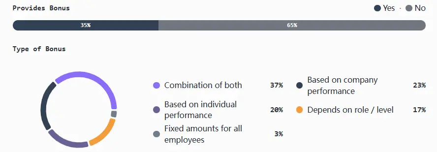 在存在奖金的情况下,奖金通常与公司和个人绩效(混合)挂钩。仅与公司挂钩、仅与个人挂钩以及基于职位/级别的模式不太常见,固定奖金也很少见。