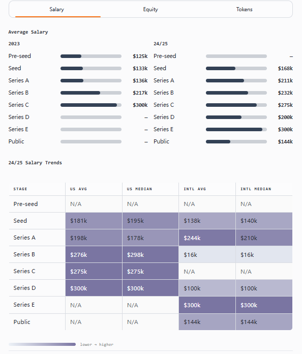按发展阶段划分,预期的模式依然成立:早期公司提供的薪资较低,但股权更多(通常是两倍),而后期团队则相反。代币总体上变得不那么常见,但在市场推广(GTM)、产品和高级国际职位中仍具有重要意义。